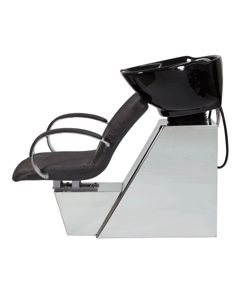 Мойка имеет устойчивый каркас из хромированного нержавеющего металла оригинальной геометрической формы. Он выгодно подчеркивает дизайн модели и гармонично сочетается с хромированными сантехническими комплектующими. При установке каркас необходимо прикрепить к полу, что обеспечит его устойчивость. Для изготовления кресла применяются материалы высокого качества, а именно плотный поролон и влагоустойчивая экокожа Премиум-класса. В одном дизайнерском стиле с мойкой можно подобрать такое оборудование для рабочего места парикмахера: